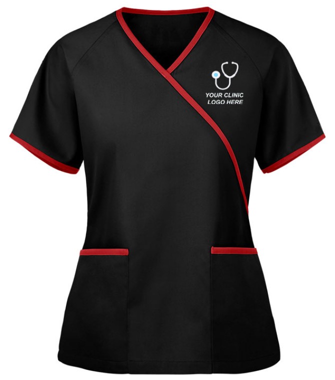 Available in trim design to mock wrap scrub top, sleeves, pockets, and neckline, with two wide patch pockets to give ample space to store your medical items.