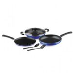 Contain | Flat Tawa 26cm, Frypan 24cm, Kadai 24cm, Glass Lid, Nylon Spoon |